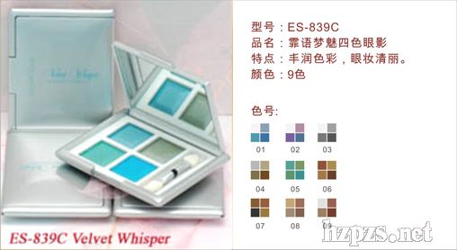 ES-839C霏语梦魅四色眼影**的精细色彩粒子工艺,带来持久丰润色彩和轻盈丝柔的霜状质感。四款清丽颜色的组合,使用灵活方便,随意搭配便可演绎动人眼妆。
